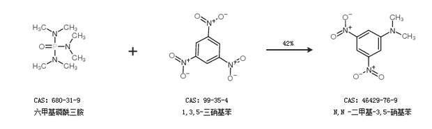 1.通过六甲基磷酰三胺和1,3,5-三硝基苯合成N,N -二甲基-3,5-硝基苯,收率约42%;