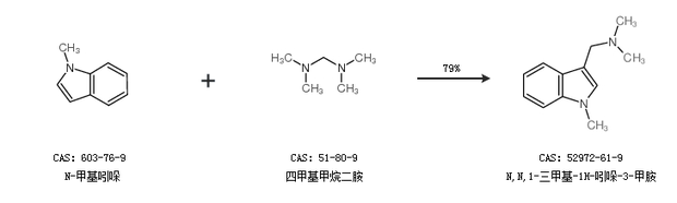 1.通过N-甲基吲哚和四甲基甲烷二胺合成N,N,1-三甲基-1H-吲哚-3-甲胺,收率约79%;