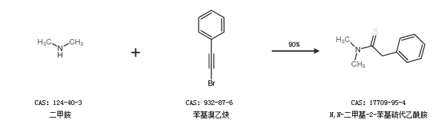 1.通过二甲胺和苯基溴乙炔合成N,N-二甲基-2-苯基硫代乙酰胺,收率约90%;