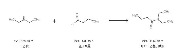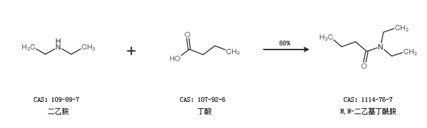 1.通过二乙胺和丁酸合成N,N-二乙基丁酰胺,收率约88%;