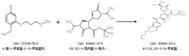 1.通过4-溴-1-甲氧基-2-(3-甲氧基丙氧基)苯和(3S,5S)-3-异丙基-2-氧代-5-[(2S,4S)-四氢-4-异丙基-5-氧代-2-呋喃基]-1-吡咯烷羧酸叔丁酯合成N-[(1S,3S)-3-[4-甲氧基-3-(3-甲氧基丙氧基)苯甲酰基]-4-甲基-1-[(2S,4S)-四氢-4-异丙基-5-氧代-2-呋喃基]戊基]-氨基甲酸叔丁酯