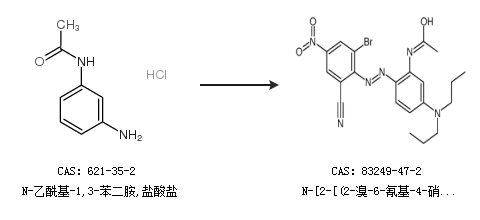 2.通过N-乙酰基-1,3-苯二胺,盐酸盐合成N-[2-[(2-溴-6-氰基-4-硝基苯基)偶氮]-5-(二丙氨基)苯基]乙酰胺