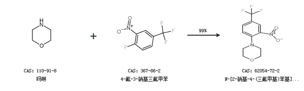 1.通过吗啉和4-氟-3-硝基三氟甲苯合成N-[2-硝基-4-(三氟甲基)苯基]吗啉,收率约99%;