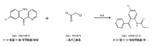 1.通过2-(2-氨基-5-溴-苯甲酰基)吡啶和一氯代乙酰氯合成N-[4-溴-2-(2-吡啶甲酰基)苯基]-2-氯乙酰胺,收率约91%;