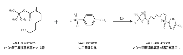 1.通过5-(N-叔丁氧羰基氨基)-1-戊醇和对甲苯磺酰氯合成n-[5-(甲苯磺酰氧基)戊基]氨基甲酸叔丁酯,收率约92%;