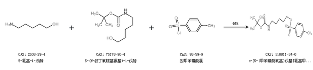 2.通过5-氨基-1-戊醇、5-(N-叔丁氧羰基氨基)-1-戊醇和对甲苯磺酰氯合成n-[5-(甲苯磺酰氧基)戊基]氨基甲酸叔丁酯,收率约46%;