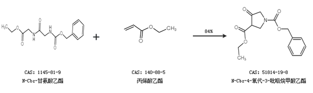 1.通过N-Cbz-甘氨酸乙酯和丙烯酸乙酯合成N-Cbz-4-氧代-3-吡咯烷甲酸乙酯,收率约84%;