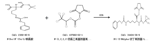 1.通过N-Boc-N''-Cbz-L-赖氨酸和N-(1,2,2,2-四氯乙氧基羰基氧)琥珀酰亚胺合成Nε-Z-NAlpha-叔丁氧羰基-L-赖氨酸羟基琥珀酰亚胺酯,收率约83%;