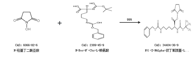 2.通过N-羟基丁二酰亚胺和N-Boc-N''-Cbz-L-赖氨酸合成Nε-Z-NAlpha-叔丁氧羰基-L-赖氨酸羟基琥珀酰亚胺酯,收率约99%;