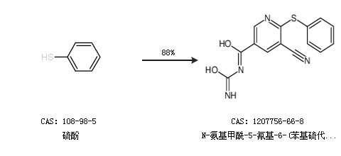1.通过硫酚合成N-氨基甲酰-5-氰基-6-(苯基硫代)烟酰胺,收率约88%;