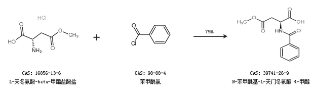 1.通过L-天冬氨酸-beta-甲酯盐酸盐和苯甲酰氯合成N-苯甲酰基-L-天门冬氨酸 4-甲酯,收率约79%;