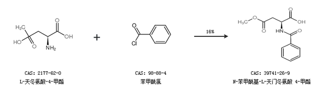 2.通过L-天冬氨酸-4-甲酯和苯甲酰氯合成N-苯甲酰基-L-天门冬氨酸 4-甲酯,收率约16%;
