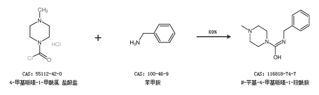 1.通过4-甲基哌嗪-1-甲酰氯 盐酸盐和苯甲胺合成N-苄基-4-甲基哌嗪-1-羧酰胺,收率约69%;