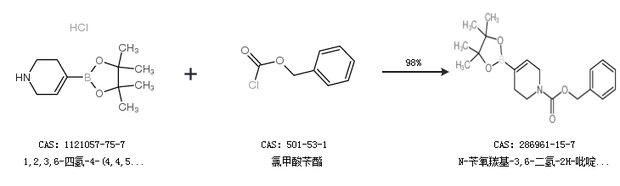 2.通过1,2,3,6-四氢-4-(4,4,5,5-四甲基-1,3,2- 二噁硼烷-2-基)吡啶盐酸盐和氯甲酸苄酯合成N-苄氧羰基-3,6-二氢-2H-吡啶-4-硼酸频哪醇酯,收率约98%;