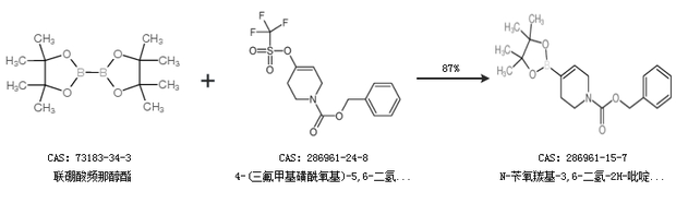 1.通过联硼酸频那醇酯和4-(三氟甲基磺酰氧基)-5,6-二氢吡啶-1(2H)-羧酸苄酯合成N-苄氧羰基-3,6-二氢-2H-吡啶-4-硼酸频哪醇酯,收率约87%;