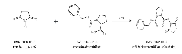 1.通过N-羟基丁二酰亚胺和N-苄氧羰基-L-脯氨酸合成N-苄氧羰基-L-脯氨酸 N-羟基琥珀酰亚胺酯,收率约76%;
