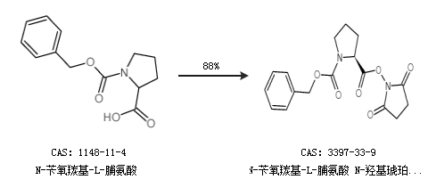 2.通过N-苄氧羰基-L-脯氨酸合成N-苄氧羰基-L-脯氨酸 N-羟基琥珀酰亚胺酯,收率约88%;