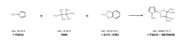 1.通过N-甲基吡咯、频哪醇和B-氯邻苯二氧硼烷合成N-甲基吡咯-2-硼酸频哪醇酯