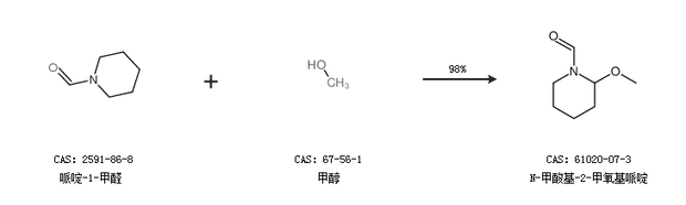 1.通过哌啶-1-甲醛和甲醇合成N-甲酸基-2-甲氧基哌啶,收率约98%;