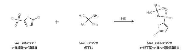 1.通过5-氯噻唑-2-磺酰氯和叔丁胺合成N-叔丁基-5-氯-2-噻吩磺酰胺,收率约91%;