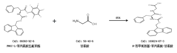 2.通过FMOC-L-苯丙氨酸五氟苯酯和甘氨酸合成N-芴甲氧羰基-苯丙氨酰-甘氨酸,收率约85%;