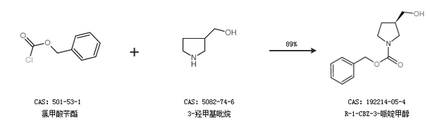 1.通过氯甲酸苄酯和3-羟甲基吡烷合成R-1-CBZ-3-哌啶甲醇,收率约89%;