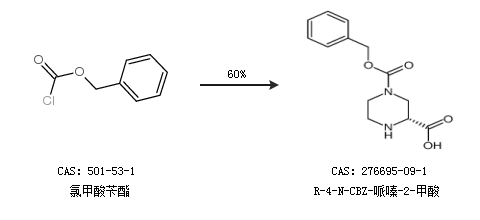 1.通过氯甲酸苄酯合成R-4-N-CBZ-哌嗪-2-甲酸,收率约60%;