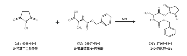 1.通过N-羟基丁二酰亚胺和N-苄氧羰基-D-丙氨酸合成Z-D-丙氨酸-OSu,收率约58%;