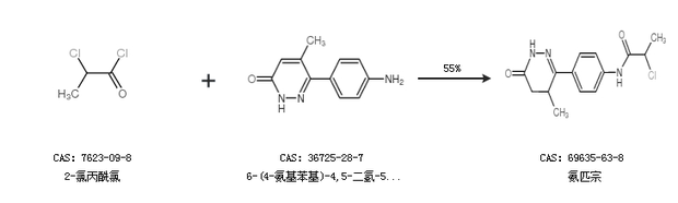 1.通过2-氯丙酰氯和6-(4-氨基苯基)-4,5-二氢-5-甲基-3(2H)-哒嗪酮合成氨匹宗,收率约55%;