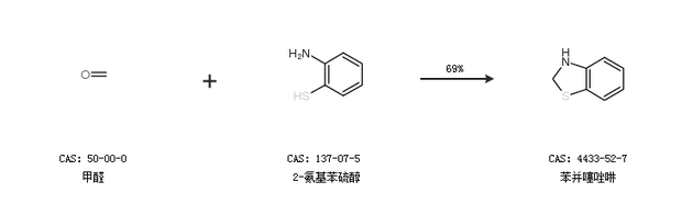 1.通过甲醛和2-氨基苯硫醇合成苯并噻唑啉,收率约69%;