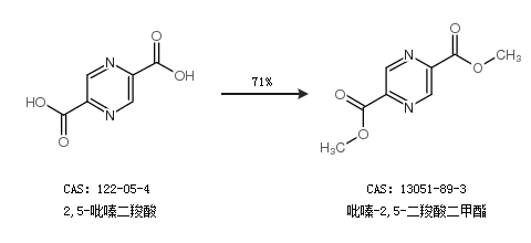2.通过2,5-吡嗪二羧酸合成吡嗪-2,5-二羧酸二甲酯,收率约71%;