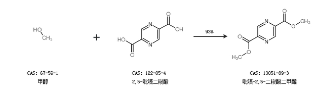 1.通过甲醇和2,5-吡嗪二羧酸合成吡嗪-2,5-二羧酸二甲酯,收率约93%;