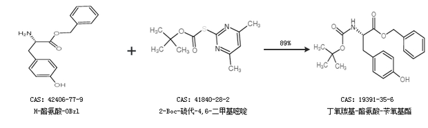 2.通过H-酪氨酸-OBzl和2-Boc-硫代-4,6-二甲基嘧啶合成丁氧羰基-酪氨酸-苄氧基酯,收率约89%;