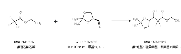 英文别名 ethyl 2,2-difluoro-3(R)-hydroxy-3-((R)-2,2-dimethyldioxolan-4-yl)propionate;3-(2,2-Dimethyl[1,3]dioxolan-4-yl)-2,2-difluora-3-hydroxy-propionic acid ethyl ester;ethyl (3R)-3-(2,2-dimethyl-1,3-dioxolan-4-yl)-2,2-difluoro-3-hydroxypropanoate;Ethyl(3RS)-2,2-Difluoro-3-(2,2-Dimethylioxolan-4-yl)Propionate;(erytro) ethyl-3-(2,2-dimethyl-1,3-dioxolan-4-yl)-2,2-difluoro-3-hydroxy propionate;Ethyl(3R,S)-2,2-difluoro-3-hydroxy-3-(2,2-dimethyldioxolan-4-yl)propionate;D-ERYTHRO-PENTONIC ACID,2-DEOXY-2,2-DIFLUORO-4,5-O-(1-METHYLETHYLIDENE)-,ETHYL ESTER;Ethyl(3RS)-2,2-Difluoro-3-(2,2-dimethyldioxolan-4-yl)propionate;D-erythro-Pentonic acid,2-deoxy-2,2-difluoro-4,5-O-(1-methylethylidene)-,ethyl ester (9CI);ethyl (R)-2,2-difluoro-3-hydroxy-3-((R)-2,2-dimethyl-[1,3]dioxoran-4-yl)propionate;(R)-ethyl 3-((R)-2,2-dimethyl-1,3-dioxolan-4-yl)-2,2-difluoro-3-hydroxypropanoate;2-Deoxy-2,2-difluoro-4,5-O-isopropylidene-D-erythro-pentonic Acid Ethyl Ester;ethyl (D-erythro)-3-(hydroxy)-2,2-difluoro-3-(2,2-dimethyldioxalane-4-yl)propionate;ethyl 2,2-difluoro-3-hydroxy-3-(2,2-dimethyl-[1,3]dioxolan-4-yl)propionate;propionate (T3);ethyl (3R,4R)-3-(2,2-dimethyl-1,3-dioxolan-4-yl)-2,2-difluoro-3-hydroxypropanoate;2-DEOXY-2,2-DIFLUORO-4,5-O-(1-METHYLETHYLIDENE)-D-ERYTHROPENTONIC ACID ETHYL ESTER;