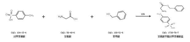 1.通过对甲苯磺酸、甘氨酸和苯甲醇合成甘氨酸苄酯对甲苯磺酸盐,收率约10%;