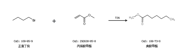 1.通过正溴丁烷和丙烯酸甲酯合成庚酸甲酯,收率约73%;