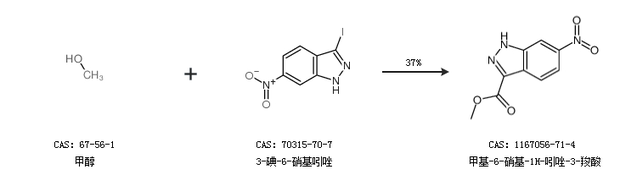 1.通过甲醇和3-碘-6-硝基吲唑合成甲基-6-硝基-1H-吲唑-3-羧酸,收率约37%;