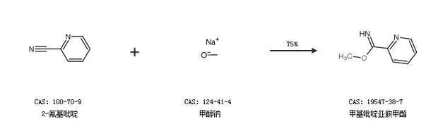 1.通过2-氰基吡啶和甲醇钠合成甲基吡啶亚胺甲酯,收率约75%;