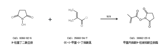2.通过N-羟基丁二酰亚胺和(E)-2-甲基-2-丁烯酰氯合成甲基丙烯酸N-羟琥珀酸亚胺酯,收率约91%;