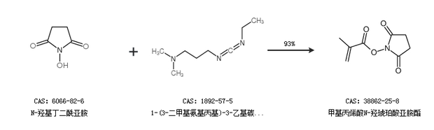 1.通过N-羟基丁二酰亚胺和1-(3-二甲基氨基丙基)-3-乙基碳二亚胺合成甲基丙烯酸N-羟琥珀酸亚胺酯,收率约93%;