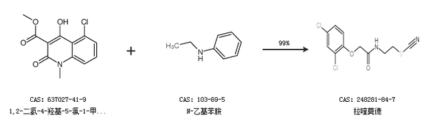 1.通过1,2-二氢-4-羟基-5-氯-1-甲基-2-氧代-喹啉-3-羧酸甲酯和N-乙基苯胺合成拉喹莫德,收率约99%;