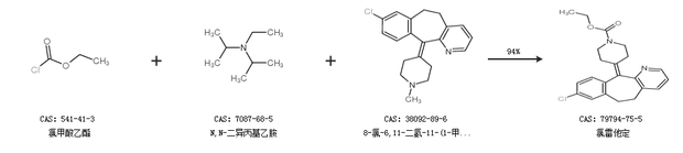 2.通过氯甲酸乙酯、N,N-二异丙基乙胺和8-氯-6,11-二氢-11-(1-甲基-4-哌啶叉)-5H-苯并[5,6]环庚烷[1,2-b]吡啶合成氯雷他定,收率约94%;