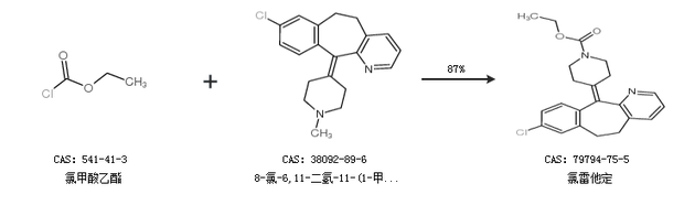 1.通过氯甲酸乙酯和8-氯-6,11-二氢-11-(1-甲基-4-哌啶叉)-5H-苯并[5,6]环庚烷[1,2-b]吡啶合成氯雷他定,收率约87%;
