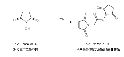 1.通过N-羟基丁二酰亚胺合成马来酰亚胺基乙酸琥珀酰亚胺酯,收率约32%;