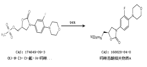 1.通过(R)-N-[3-(3-氟-(4-吗啉基)苯基)-2-氧代-5-噁唑烷基]甲醇甲磺酸酯合成吗啉恶酮相关物质A,收率约94%;