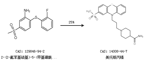 1.通过2-(2-氟苯基硫基)-5-(甲基磺酰基)苯胺合成美托哌丙嗪,收率约25%;