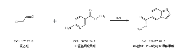 2.通过氯乙醛和6-氨基烟酸甲酯合成咪唑并[1,2-a]吡啶-6-甲酸甲酯,收率约80%;