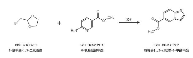 1.通过2-溴甲基-1,3-二氧戊烷和6-氨基烟酸甲酯合成咪唑并[1,2-a]吡啶-6-甲酸甲酯,收率约30%;