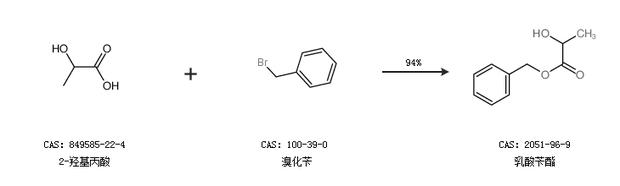 1.通过2-羟基丙酸和溴化苄合成乳酸苄酯,收率约94%;