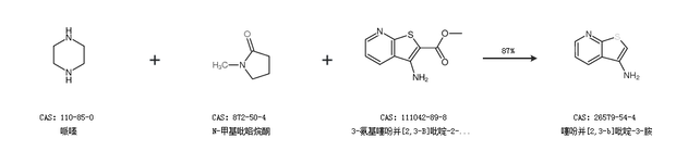 1.通过哌嗪、N-甲基吡咯烷酮和3-氨基噻吩并[2,3-B]吡啶-2-甲酸乙酯合成噻吩并[2,3-b]吡啶-3-胺,收率约87%;